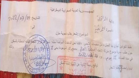 تجدون أسفله نموذجا لإشعارات التهديد التي وزعتها السلطات الصحراوية على بعض اللأاجئين، و كذلك رابط للتسجيل الصوتي لأحد الصحراويين المنتقدين لهذا الإجراء التعسفي: