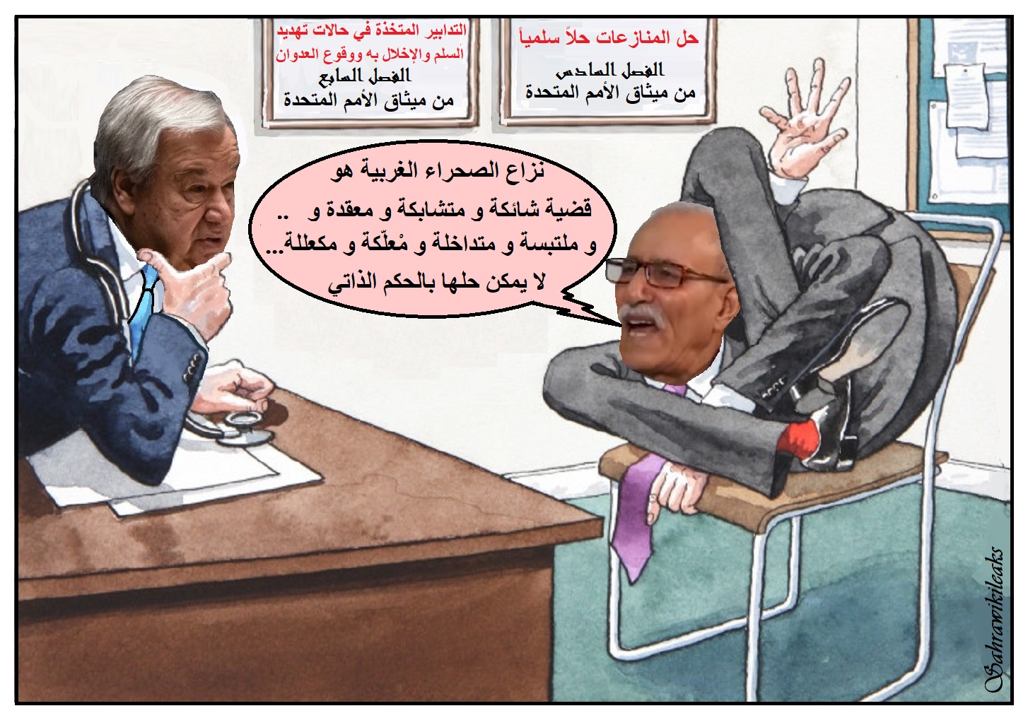 التمثيلية الصحراوية في نيويورك تحدثت في ديباجة البيان عن ما أسماه الرئيس “إبراهيم غالي”استعداد القيادة الصحراوية لـ “تقاسم فاتورة السلام”، و هذه العبارة لينة و تذكرنا بإحدى رسائل القيادات الجزائرية إلى الإليزيه، و التي تمت صياغتها في سجون فرنسا السياسية للمطالبة فيها بتقاسم ثروات البلاد و الحفاض على مصالح فرنسا و رعاياها …، مقابل السماح للجزائريين بتقرير مصير الشعب الجزائري في استفتاء شعبي يتضمن خيار البقاء تحت حكم فرنسا أو الاستقلال عنها مع البقاء متعاونين مع فرنسا،… و مقترحات الأخ “إبراهيم غالي” تشبه كثيرا مقترحات القيادة الثورية الجزائرية حد التطابق، و التي قبلت بها فرنسا و حولتها إلى “اتفاقيات إيفيان” الملعونة.