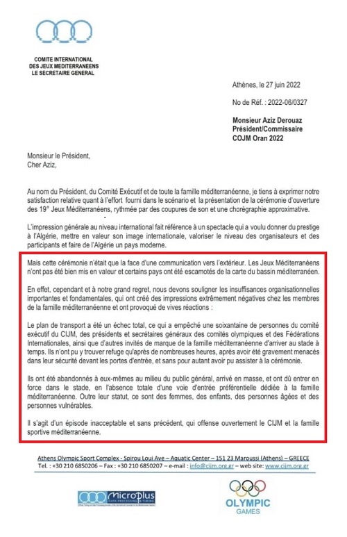 و حسب ما جاء في المراسلة التي نشرتها العديد من وكالات الأنباء الدولية، فقد أشادت اللجنة الدولية بحفل افتتاح الألعاب المتوسطية إلا أنها اعتبرته مجرد واجهة للتسويق الخارجي، مشيرة إلى أنها رصدت مجموعة من الاختلالات الخطيرة على المستوى التنظيمي، أهمها ضعف التغطية الإعلامية داخل الجزائر و عدم تسليط الضوء على الألعاب المتوسطية، فضلا عن إزاحة بعض الدول من خريطة الحوض المتوسطي خلال حفل الافتتاح.