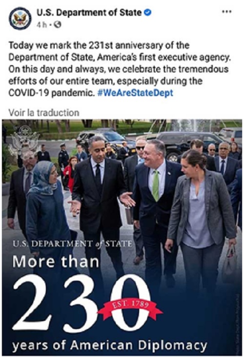 هناك مثل انجليزي يقول: “إن الصورة أبلغ من ألفَ كلمة“،… تذكرت هذه المقولة وأنا أحاول أن استقري الرسائل التي حملتها الصورة التي اختارتها الخارجية الأمريكية بمناسبة احتفالها بالذكرى الـ 231 لنشأتها، حيث نشرت – تحت عنوان “أكثر من 230 سنة من الدبلوماسية الأمريكية”- صورة لوزير الخارجية الأمريكي،”بومبيو”، رفقة المسؤول الأمني الأول للمغرب، “عبد اللطيف حموشي“، المدير العام لجهازي الاستخبارات المدنية (المعروف اختصارا بـ “الديستي”) و “الأمن الوطني”، و هي الصورة التي التقطت خلال زيارة المسؤول الأمريكي الأخيرة للرباط.