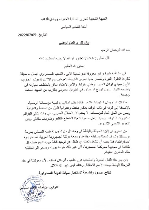 المصيبة الأكبر، أن “مركزية التنظيم السياسي” ، التي يشرف عليها الأخ “خطري أدوه”، بدل أن تتعاطى مع حادثة اختطاف سيارة “سيدي وكال”، بالموضوعية المطلوبة و توضيح السياق العام الذي أدى إلى هذا التهور من المحتجين ، بادرت يوم 2022.07.06، إلى إصدار بيان إلى الرأي العام (تجدون نسخة أسفله) جاء في مقدمته تحريف للآية الكريمة : “و لا تعتدوا إن الله لا يحب المعتدين”، حيث كتبت “و لا تعتدون إن الله لا يحب المعتدين”، و بعد ذلك حاولت تخوين المعتدين من خلال قولها بأن “هذا الاعتداء يمثل استهداف غاشما، ظالما بكل المقاييس، لهيبة مؤسساتنا الوطنية، بالإضافة إلى كونه في ذات الوقت يعكس بخبث و عدوانية النيل من السمعة و الكرامة و يمس من الحق العام لمؤسساتنا، لا يخدم إلا الاحتلال المغربي، في وقت يتلقى الهزائم المتكررة، النكراء –يوميا- بفعل صمودنا شعبنا المنقطع النظير و ضربات مقاتلي جيش التحرير الشعبي الأشاوس“…. ليبقى السؤال أين هي الهزائم المتكررة اليومية للاحتلال المغربي؟ !!! … و أين هي نتائج ضربات مقاتلي الجيش الشعبي بعد عام و نصف من الأقصاف و الدك؟ !!!